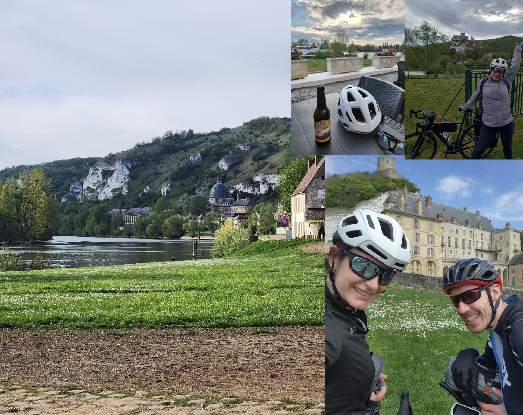 De bon matin, nous nous dirigeons donc vers la gare Saint-Lazare pour prendre notre TER jusqu'à Mantes-la-jolie. Ne vous fiez pas au nom: apparemment c'est craignos. Ce matin, l'humeur est au beau fixe même si nous avons failli rater le train (à 3 minutes près... heureusement que nous avons de bons mollets). Nous arrivons sans encombres et, contraints par notre rituel gourmand, nous arrêtons dans la maison Guitton prendre des provisions pour la route: sandwich au poulet et diplomate (alias parpaing). Nous nous mettons alors en route en suivant la Seine. Ce début d'étape est reposant: qu'il est bon d'entendre le silence de la nature et les gazouillis d'oiseaux. Il fait plutôt bon, un rayon de soleil vient même nous forcer à nous dévêtir. Nous sommes cernés par la nature: à gauche la Seine, à droite de belles falaises de craie avec quelques grottes troglodyte et même une jolie église parfaitement camouflée dans le calcaire. Notre première étape est l'un des plus beaux villages de France: La Roche-Guyon avec son majestueux château surmonté d'un imposant donjon ayant vu naître François de la Rochefoucauld. Nous reprenons rapidement la route pour essayer de déjeuner peu après Giverny. Nous réalisons trop tard que c'est ici qu'est le restaurant de David Gallienne (saison 11 de Top Chef), nous aurions volontiers glissé nos pieds sous cette table étoilée. Au lieu de cela, nous arrivons déjà aux jardins de Monnet où s'empressent les bus de touristes. Nous trouvons un petit terrain à l'abri des gaz d'échappement pour déjeuner et goûter notre délicieux mais consistant parpaing. Après un petit détour dans le centre piéton de Giverny qui expose de petites échoppes d'artisanat, nous reprenons notre route pour le grand Nord. Nous arrivons aux Andelys en fin d'après-midi. Nous avons visiblement faim, un campeur nous passe devant en cachant son goûter. Après avoir monté notre campement au beau milieu des châteaux gonflables et des bambins qui s'époumonent, nous nous enfuyons prendre un petit rafraîchissement bien mérité au salon de thé de la Villa Aliénor. Nous n'avons décidément rien à envier aux croisiéristes que nous apercevons à l'autre bout du gazon, que nous suivrons jusqu'à Rouen. L'heure du diner sonne mais nous n'avons pas pris nos précautions: nous ne sommes attendus nulle part pour passer la soirée. Après quelques tentatives infructueuses pour trouver un restaurant prêt à nous accueillir (dont un restaurant marocain qui a tout simplement l'air fabuleux), nous terminons dans un kebab chique berlinois, où l'employé a la gentillesse de nous servir un petit thé pour attendre nos sandwichs. Nous prenons à emporter et revenons avec notre paquet en bord de Seine, attristés de ne pas avoir pu trouver de dessert digne de ce nom. On ne nous y reprendra plus, nous serons plus prudents les prochains jours. Nous revenons alors au camping et nous endormons au son des ronflements de nos voisines bikepackeuses.