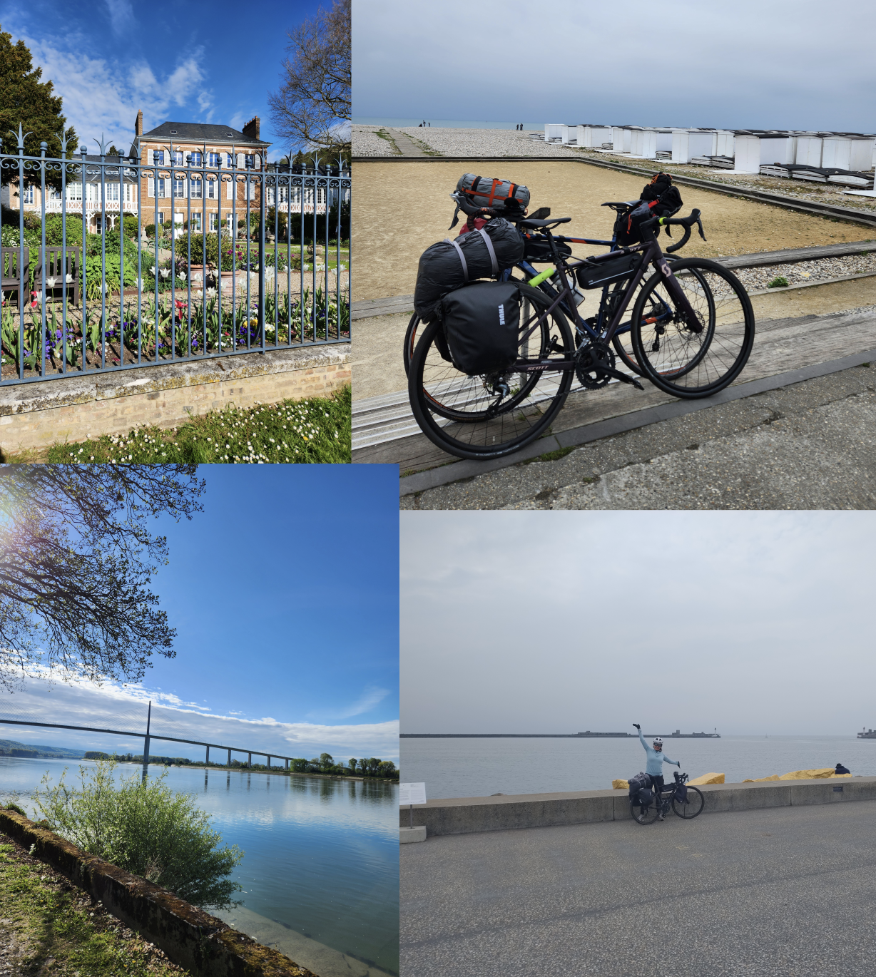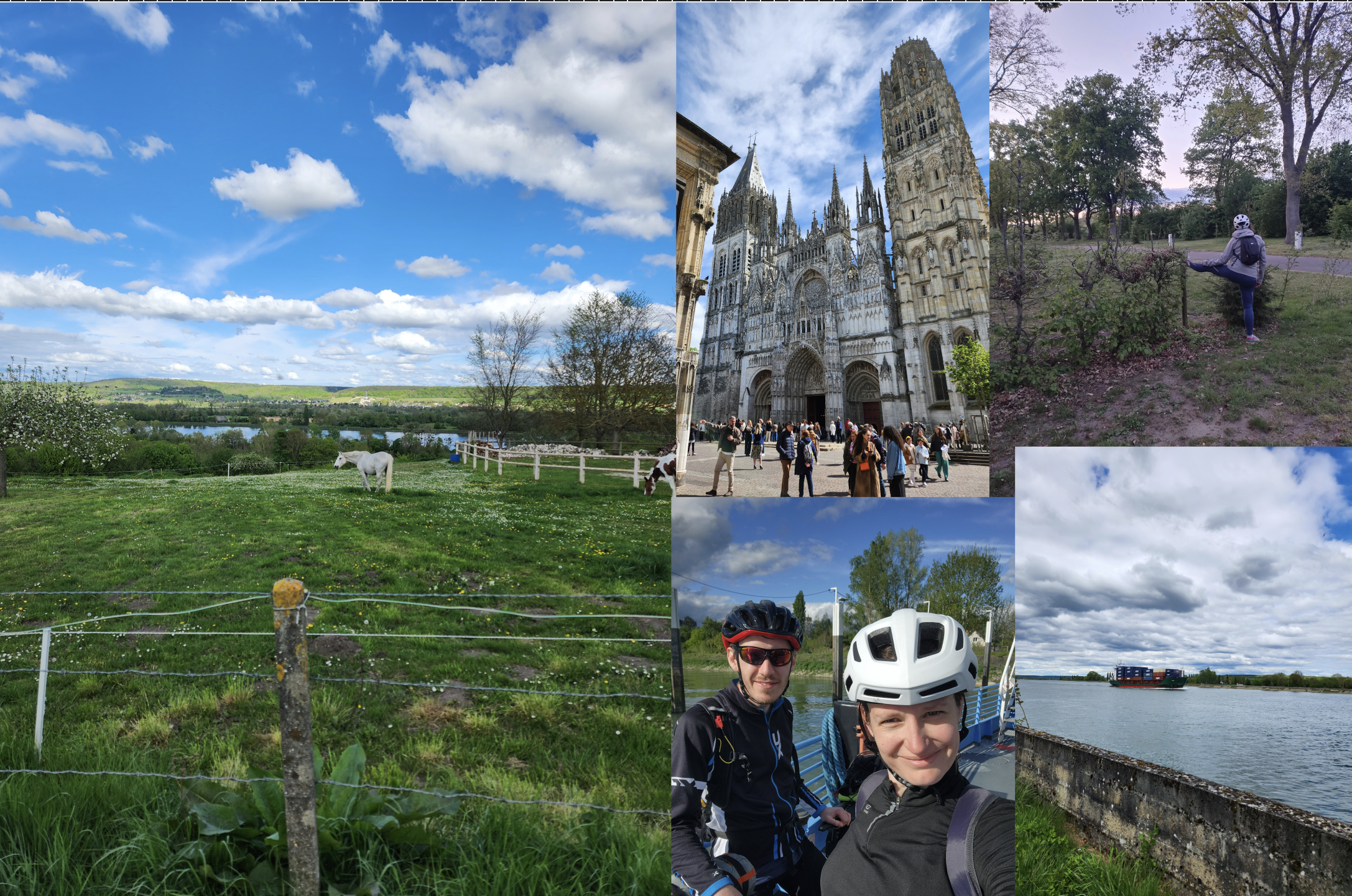 C'est reparti pour une belle journée de vélo, il fait frais ce matin mais du beau temps est annoncé pour la journée. Nous décidons de prendre notre petit déjeuner au Fournil du Bord de Seine. Il nous faut bien ça car la journée sera longue avec plus de 100kms de prévus (les premiers 100kms d'Alexia !!). Après la tentative de suicide impromptue du porte bagage d'Alexia (le pauvre il a bien raclé par terre ...), on décide de ne pas trainer et de tirer rapidement jusqu'à Rouen, peut être pourrons nous y retrouver Quentin et Emma. Nous coupons le bras de la Seine au niveau d'Igoville, la montée est ardue mais elle nous permet de gagner un précieux temps pour arriver vers l'heure du déjeuner à Rouen. Nous arrivons pile poil pour la fin de la messe, on aperçoit d'ailleurs l'évêque distribuant ses bénédictions (et oui c'est Pâques). De notre côté, nous sommes plutôt attirés par les chocolats et Alexia propose une petite halte dans un chocolatier finement nommé "Choc Ô lat" à deux pas de la cathédrale Notre-Dame de Rouen. A la sortie de l'église, c'est la course, les petites familles se pressent pour aller dévorer le pâté de Pâques pendant que nous cherchons de quoi déjeuner. Nous jetons notre dévolu sur un stand du marché qui vend des plats indiens. Nous prenons à emporter et décidons de manger dans le Parc de l'hôtel de Ville, repaire d'étudiants nous faisant penser au jardin Lecoq par certains côtés. Nous nous apercevons au moment de repartir en longeant les quais que nous aurions pu nous arrêter ici pour déjeuner; ce sera pour une prochaine fois. La deuxième partie de la journée est moins agréable, le quai de Danemark est beaucoup moins accueillant que les bords de Seine dont nous avons l'habitude et nous entrons désormais dans la zone portuaire: Rouen est le premier port exportateur céréalier d'Europe, autant dire que les cargos défilent et que les installations ne sont pas là pour embellir le paysage. Nous prenons le bac de Sahurs pour traverser la Seine et en profitons pour nous arrêter dans un petit café à La Bouille. Lors de notre pause, nous voyons un groupe de bikepackeurs passer dans le sens inverse avec un immense drapeau Normand. La route que nous souhaitons emprunter pour la suite de l'itinéraire s'est apparemment affaissée mais le serveur nous indique: "vous inquiétez pas ça paaasse large !". Nous décidons de lui faire confiance et repartons vers le Nord: en effet, ça passe. Le bord de Seine est de nouveau coquet avec de belles maisons et de petite montées (celle juste avant Bardouville, elle a un peu piqué les mollets). On termine notre journée à travers champs avec de jolis chèvres acrobates, chevaux et poneys. Le camping de la base de loisir est désert, nous y installons notre tente puis filons à la petite auberge de Jumièges juste à côté de l'Abbaye. Rien à voir avec le kebab chique de la veille, cette fois-ci nous nous régalons et repartons le ventre plein pour faire une bonne nuit. Le retour du restaurant fait un peu mal aux pattes, nous ne nous étions pas rendu compte que ça allait autant remonter pour le retour. Journée accomplie: bravo Alexia pour tes premiers 100kms (104,88 au GPS) !!!
